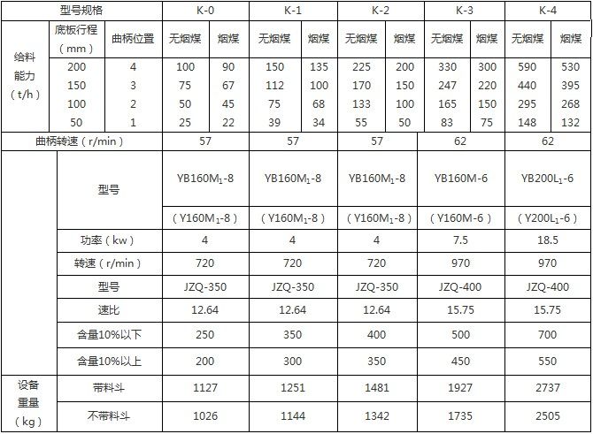 K型往復(fù)式給煤機(jī),適用于發(fā)電廠煤礦地面生產(chǎn)系統(tǒng)和選煤廠中,將煤炭由上段工藝設(shè)備中均勻的給入下端設(shè)備中。給煤機(jī)主要有機(jī)架底板(給煤槽),傳動平臺、漏斗閘門,托輥等組成。有不帶閘門的和帶閘門及進(jìn)料漏斗等形式。訂貨時說明,如采用防爆電機(jī),訂貨時需注明。
