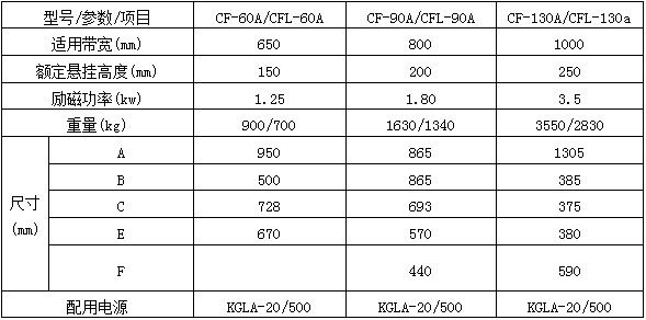 概述: CF、CFL系列懸掛式電磁除鐵器,采用全封閉的多工作磁極磁路結構,一直以操作方便,性能穩定可靠、價格合理,維修率低,深得用戶的信賴,全封閉的多工作磁極磁路結構,是惡劣工作環境中除鐵的常用設備。該系列產品由于采用計算機輔助設計優化改進了產品結構,其技術參數達到了國外同類產品的先進水平。 技術參數: